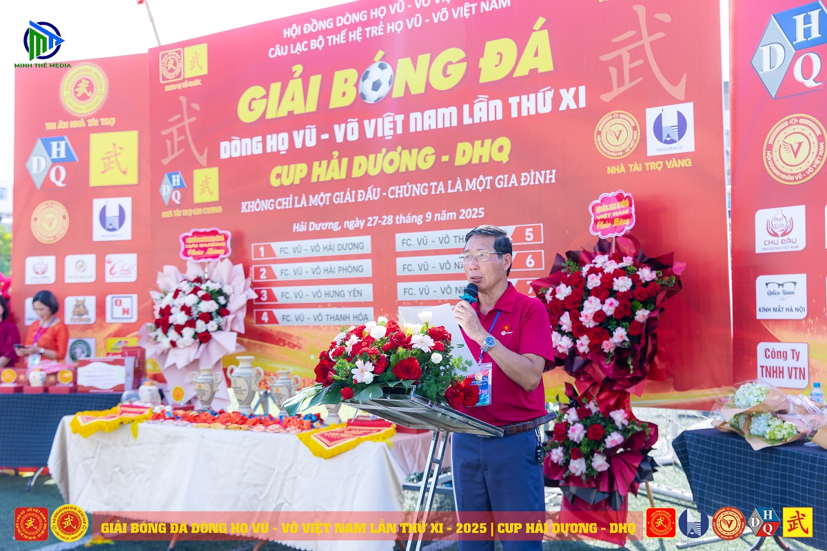Ông Vũ Chí Nghiêm, Chủ tịch HĐDH Vũ - Võ Hải Dương - Nhà tài trợ Kim cương của giải đã phát biểu chào mừng, động viên và khẳng định đây không chỉ là những trận cầu đẹp mắt, mà còn là sợi dây gắn kết dòng họ, khích lệ tinh thần “Thi đấu hết mình - Đoàn kết - Trung thực - Cao thượng”.