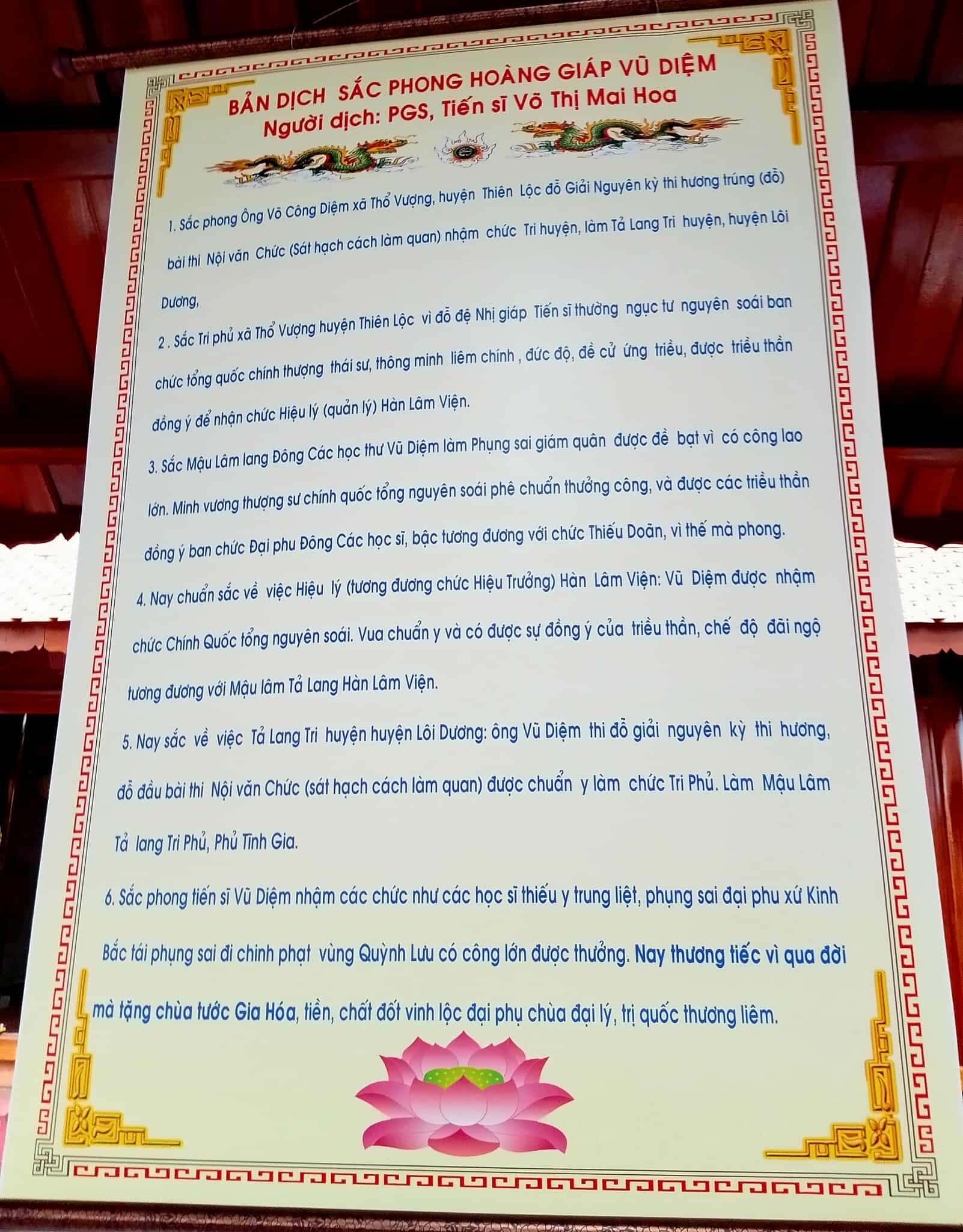 Bản dịch sắc phong Hoàng giáp Vũ Diệm do PGS. TS Võ Thị Mai Hoa dịch. Ảnh: Võ Tá Vinh