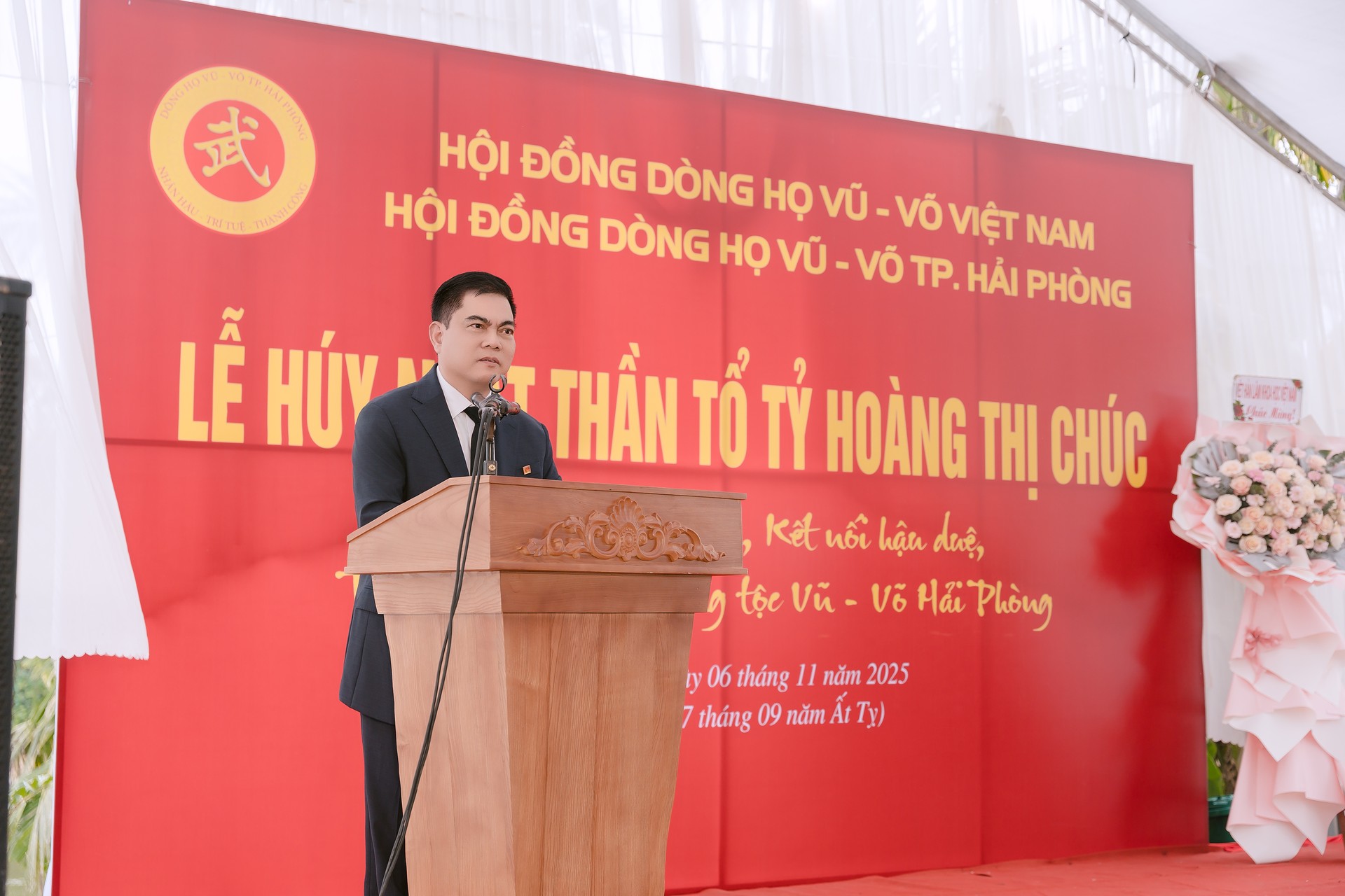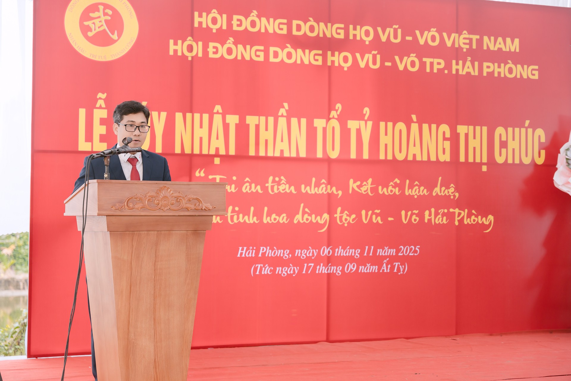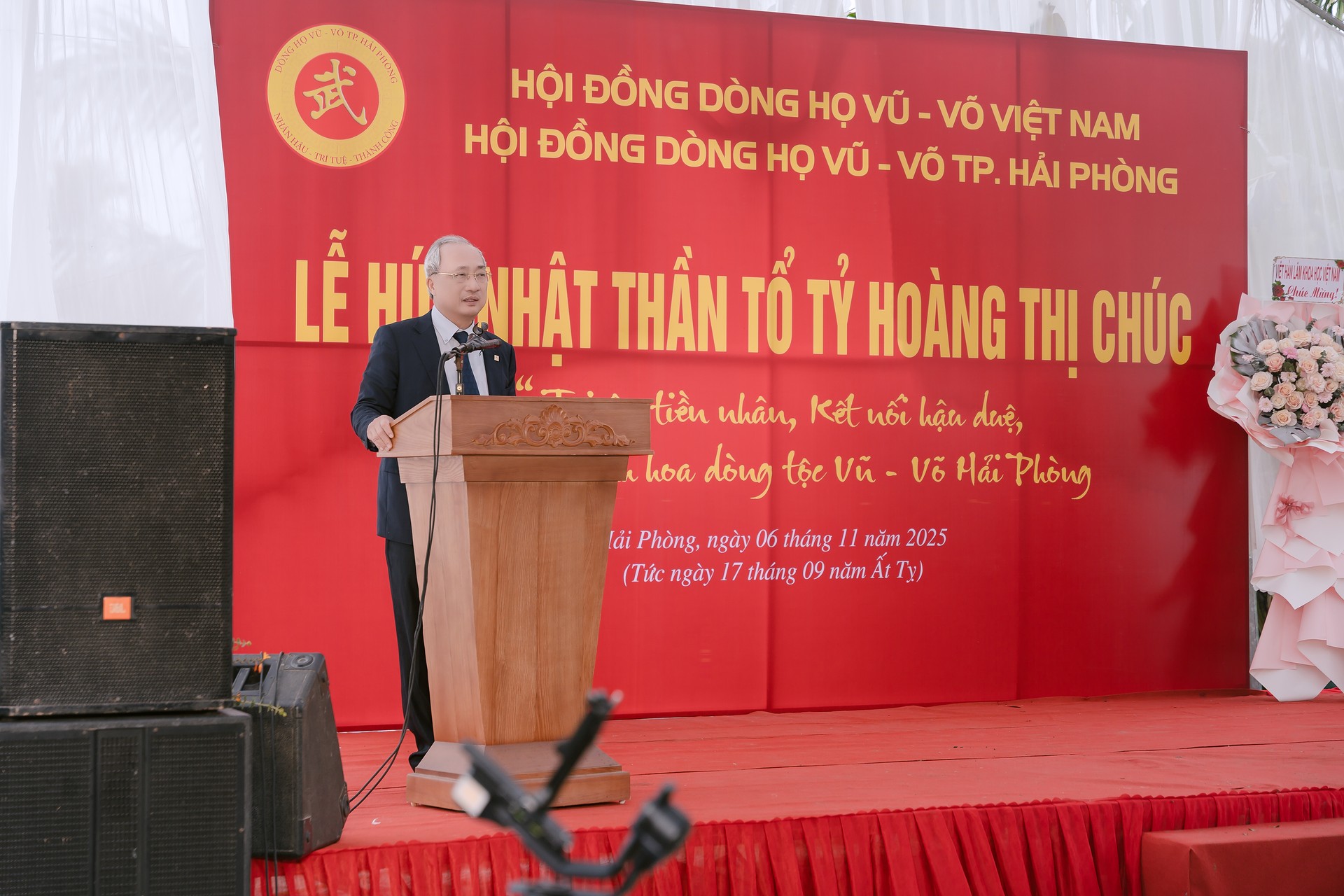 Hôm nay, chúng ta có mặt tại Từ đường Dòng họ Vũ - Võ TP. Hải Phòng, nơi linh thiêng, nơi con cháu khắp muôn nơi quy tụ là dịp để mỗi người chúng ta thành kính dâng nén tâm hương, thể hiện đạo lý “Uống nước nhớ nguồn”, tỏ lòng tri ân tiên tổ và khẳng định tinh thần đoàn kết, bản sắc và truyền thống tốt đẹp của họ Vũ - Võ Việt Nam.”