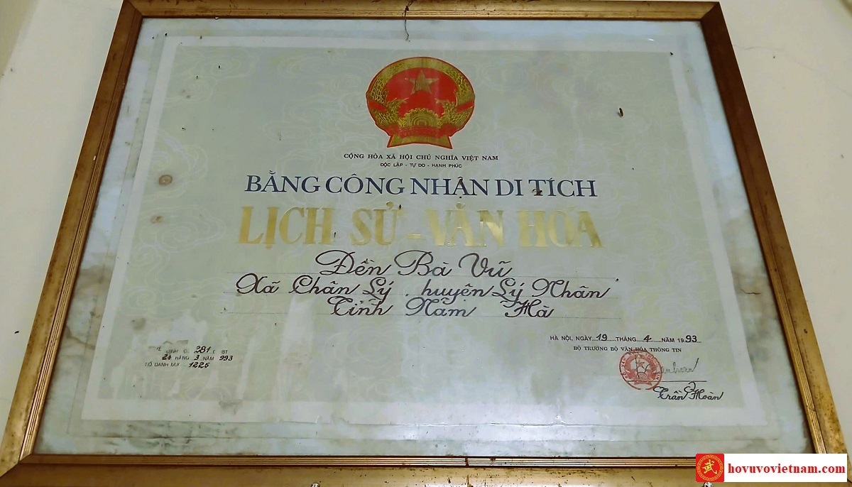 Trải qua hơn năm trăm năm, ngôi đền được trùng tu, tôn tạo nhiều lần. Năm 1993, Bộ Văn hóa và Thông tin đã cấp Bằng công nhân di tích Lịch sử - Văn hóa đối với Đền Bà Vũ. Năm 2023, Lễ hội đền Bà Vũ được công nhận vào Danh mục Di sản Văn hoá phi vật thể Quốc gia. Lễ hội Đền Bà Vũ năm 2025 diễn ra từ ngày 18 đến 20 tháng Tám âm lịch, là điểm đến linh thiêng thu hút đông đảo nhân dân địa phương, con cháu họ Vũ - Võ và du khách thập phương.