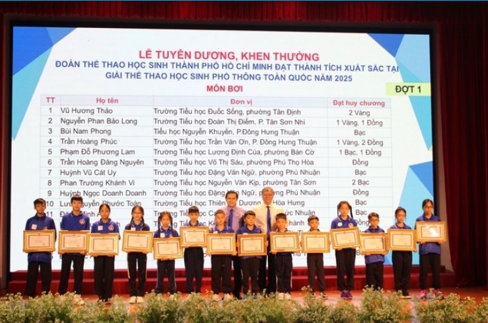 Ngày 11/11/2025, Sở Giáo dục và Đào tạo TP. Hồ Chí Minh tổ chức lễ tuyên dương khen thưởng đoàn thể thao học sinh TP. Hồ Chí Minh đạt thành tích xuất sắc tại giải thể thao học sinh phổ thông toàn quốc năm 2025. Nữ sinh Vũ Hương Thảo, học sinh lớp 5, Trường tiểu học Đuốc Sống, phường Tân Định với việc xuất sắc giành 2 Huy chương Vàng bơi lội tại giải đã đứng đầu tiên trong danh sách được khen thưởng, nhận Bằng khen của Chủ tịch UBND TP. Hồ Chí Minh.