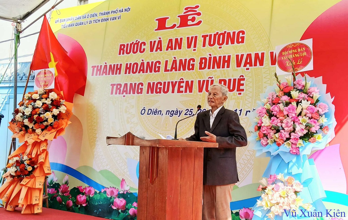 Ông Trần Văn Hải, Trưởng Tiểu ban quản lý di tích đình Vạn Vĩ báo cáo tóm tắt quá trình chuẩn bị, tổ chức và thực hiện việc dựng tượng thờ Trạng nguyên Vũ Duệ
