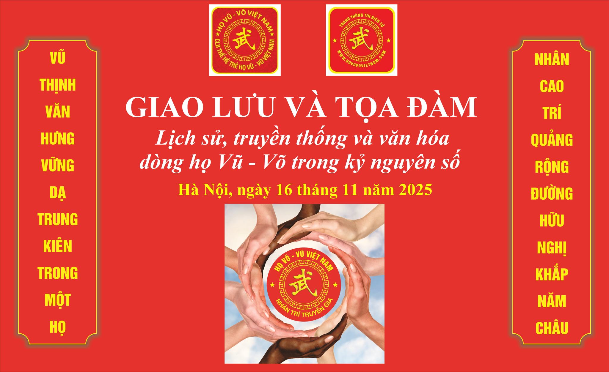 (hovuvovietnam.com) - Chương trình Giao lưu và Tọa đàm với chủ đề “Lịch sử, truyền thống và văn hóa dòng họ Vũ - Võ trong kỷ nguyên số” sẽ được tổ chức từ 8h30’ đến 14h Chủ nhật, ngày 16/11/2025 tại Sảnh Hồng Kông, Nhà hàng Thuý Nga, số 463 phố Đội Cấn, TP. Hà Nội.
